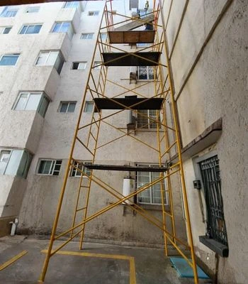 Se caracteriza por su diseño que permite una plataforma amplia y estable, ideal para realizar tareas que requieren un espacio de trabajo seguro y accesible. Este tipo de andamio es comúnmente utilizado en la instalación de techos, trabajos de pintura, y en la construcción de estructuras donde se necesita un soporte adicional.